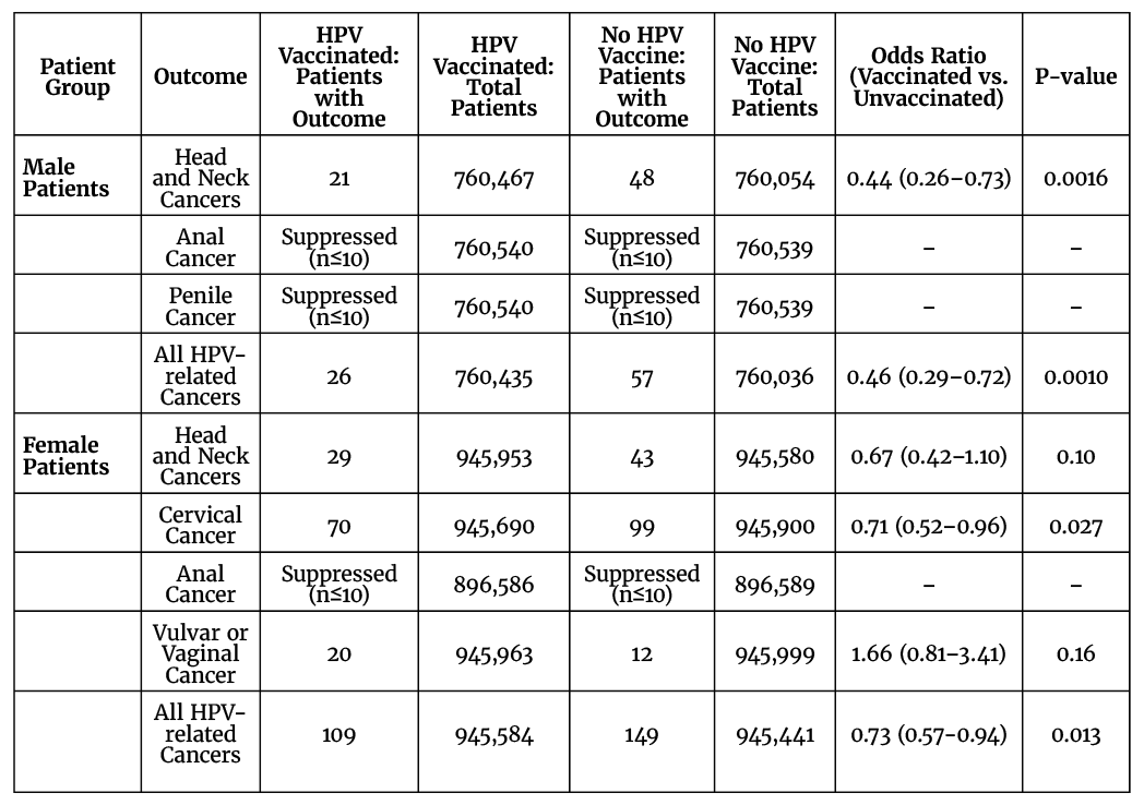 - HPV: An American retrospective cohort study was conducted using a patient population selected from the TriNetX United States Collaborative Network. Patients 9-39 years old attending medical encounters where any vaccine was administered between 1/1/2010 and 12/31/2023 were divided into two cohorts: patients vaccinated for HPV at least five years prior and those no history of HPV vaccination. The results were impressive, vaccination vs. HPV significantly reduced not only cervical cancer in women, but also anal and head/neck cancer in both genders, as well as penile cancer in males.