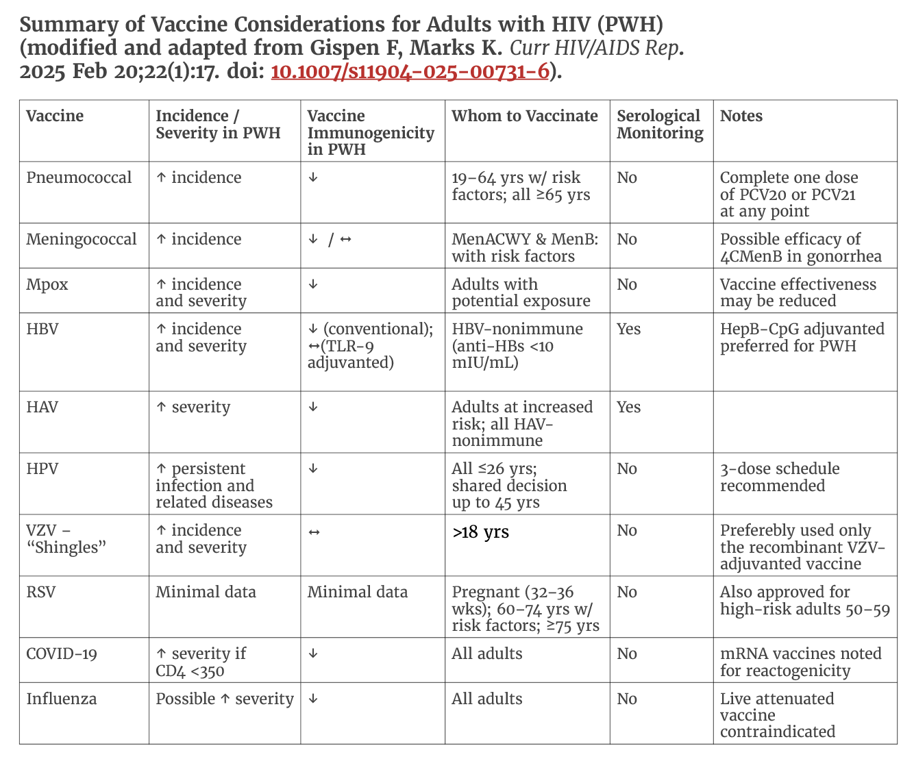 - Gispen F, Marks KM. Update on Vaccination Recommendations for Adults with HIV. Curr HIV/AIDS Rep. 2025 Feb 20;22(1):17. doi: 10.1007/s11904-025-00731-6.